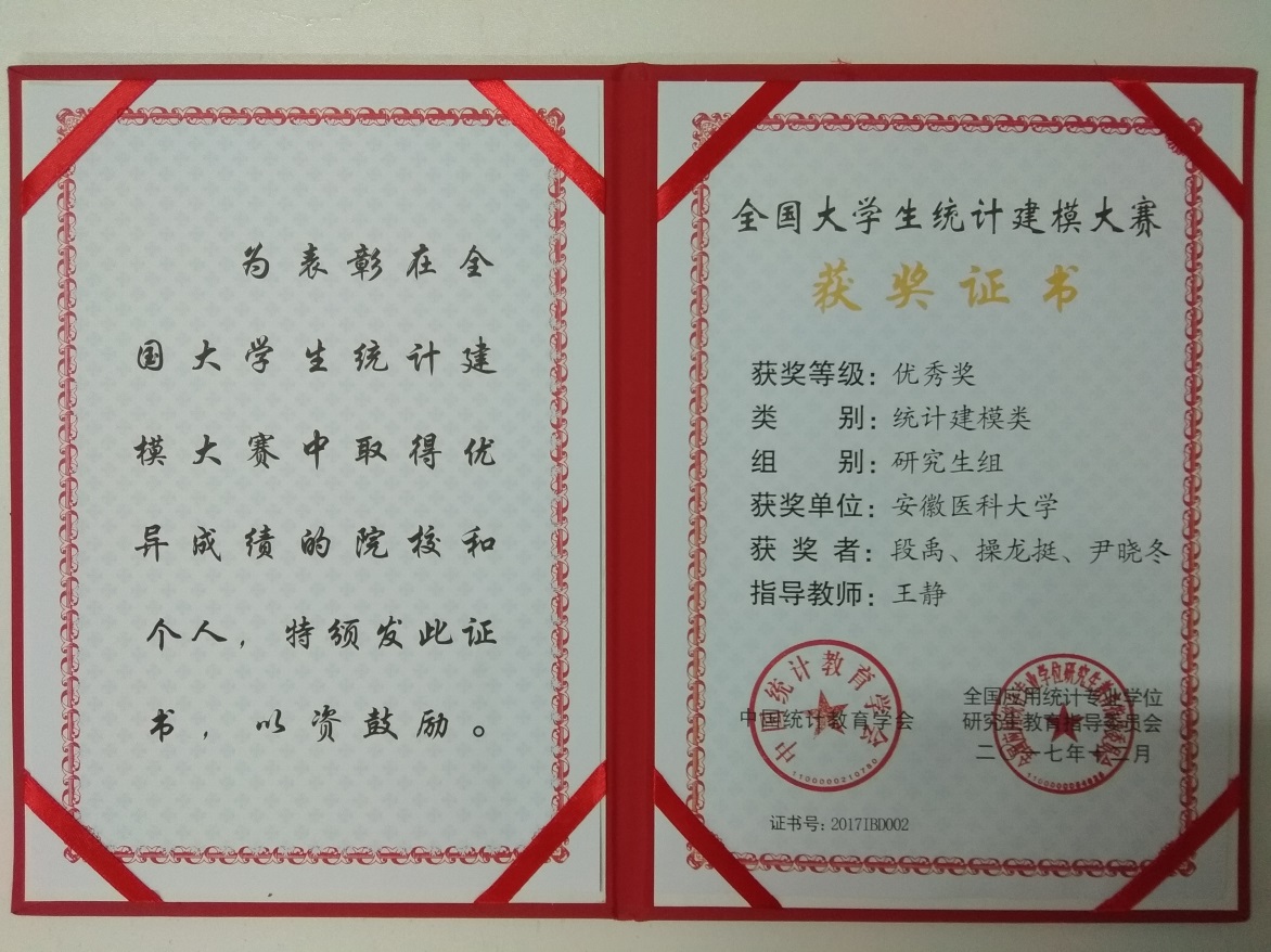 全国大学生统计建模大赛由中国统计教育学会、全国应用统计专业学位研究生教育指导委员会联合举办,旨在提高大学生的数据挖掘、数据分析、运用统计建模理论和计算机处理数据的能力,加强创新思维意识,解决社会实际问题。本次比赛从2017年5月份就拉开了序幕,有来自全国多所知名高校共1000多支队伍参赛。公共卫生学院组成了由杨丽娟、段禹同学作为队长的两组参赛队伍,在导师王静教授的指导下,系统学习统计建模知识和相关的统计软件操作技能,攻克多重难关,分别荣获统计建模类二等奖和优秀奖。(公共卫生学院 杨丽娟)