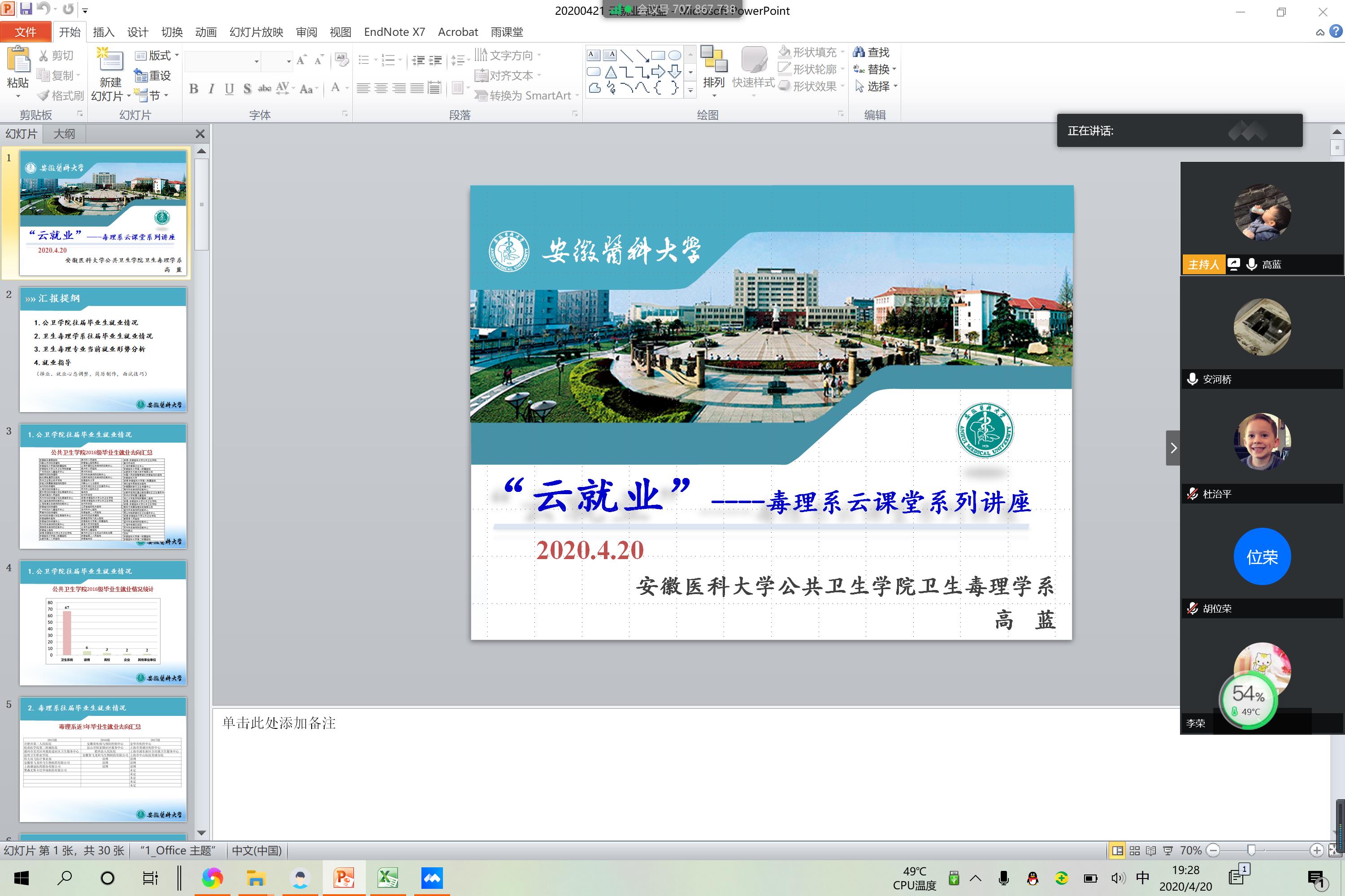 为保证研究生疫情防控期间“停课不停学”,公共卫生学院创新管理工作方式,自4月份以来陆续开启“云端”系列讲座。党委副书记何婷婷“云党课”生动开讲,结合疫情防控鲜活事例,引导全体研究生坚定“四个自信”,厚植家国情怀。王华、苏普玉、高蓝等多位教师结合学科专业特色开展“云科研”、“云就业”线上讲座,把握毕业季关键节点,因时制宜为学生介绍科研方法和学习计划,指导毕业生了解就业形势,提升就业硬实力。研究生辅导员针对学生遇到的具体问题“一对一”开展“云指导”,为学生答疑解惑。同时,学院持续关注疫情防控期间研究生心理健康问题,组织开展“云心理”专题讲座。