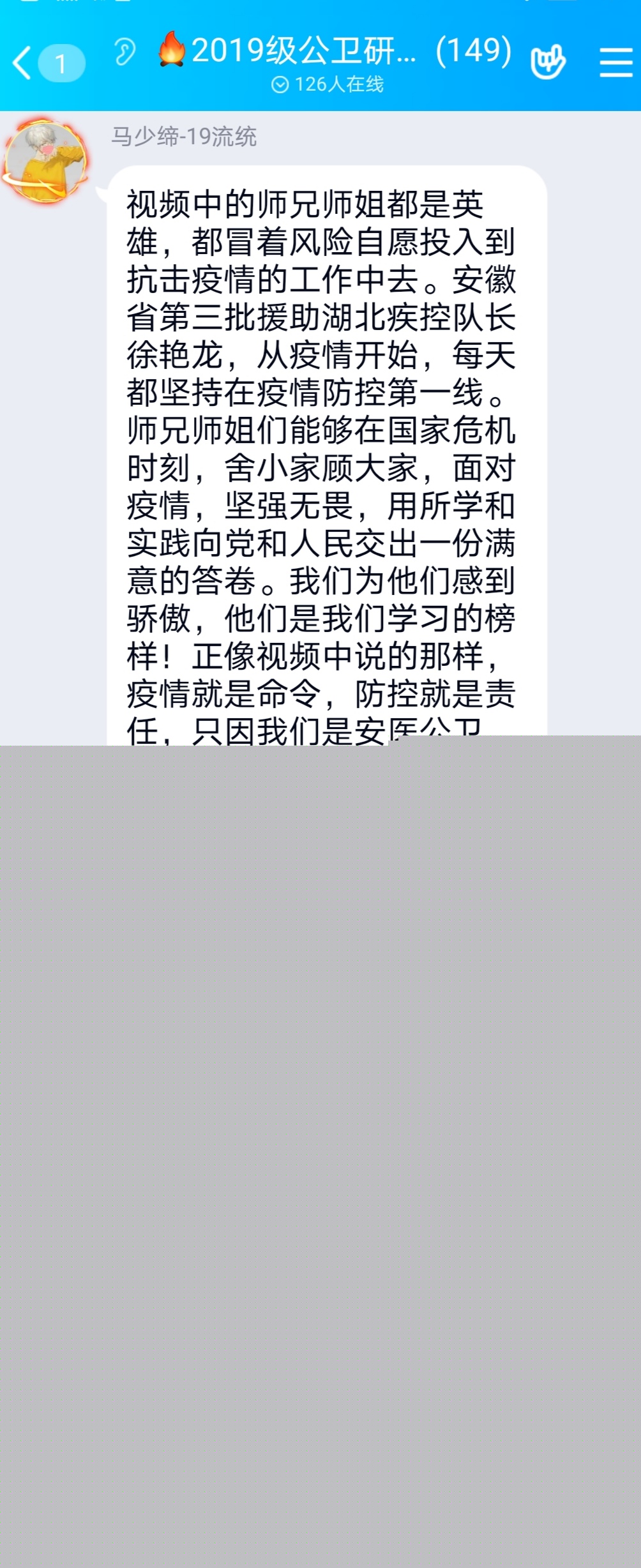 5月14日,该院组织全体研究生线上开展主题为“疫情防控,公卫担当”的“云班会”,观看学院精心制作的关于公卫校友疫情防控的事迹视频,以身边人讲述身边事,激励学子提升专业责任感和使命感。视频中,十几位公卫校友从疫情防控一线寄来句句叮嘱,鼓励在校学生努力夯实专业知识,培养专业技能,为今后投身公共卫生事业打下坚实基础。同学们云端讨论热烈,思想引领入脑入心。