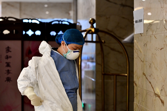 2月22日,采集完咽拭子后,贵州省遵义市汇川区疾控中心工作人员周灵君将厚厚的防护服慢慢脱下来。人民视觉供图