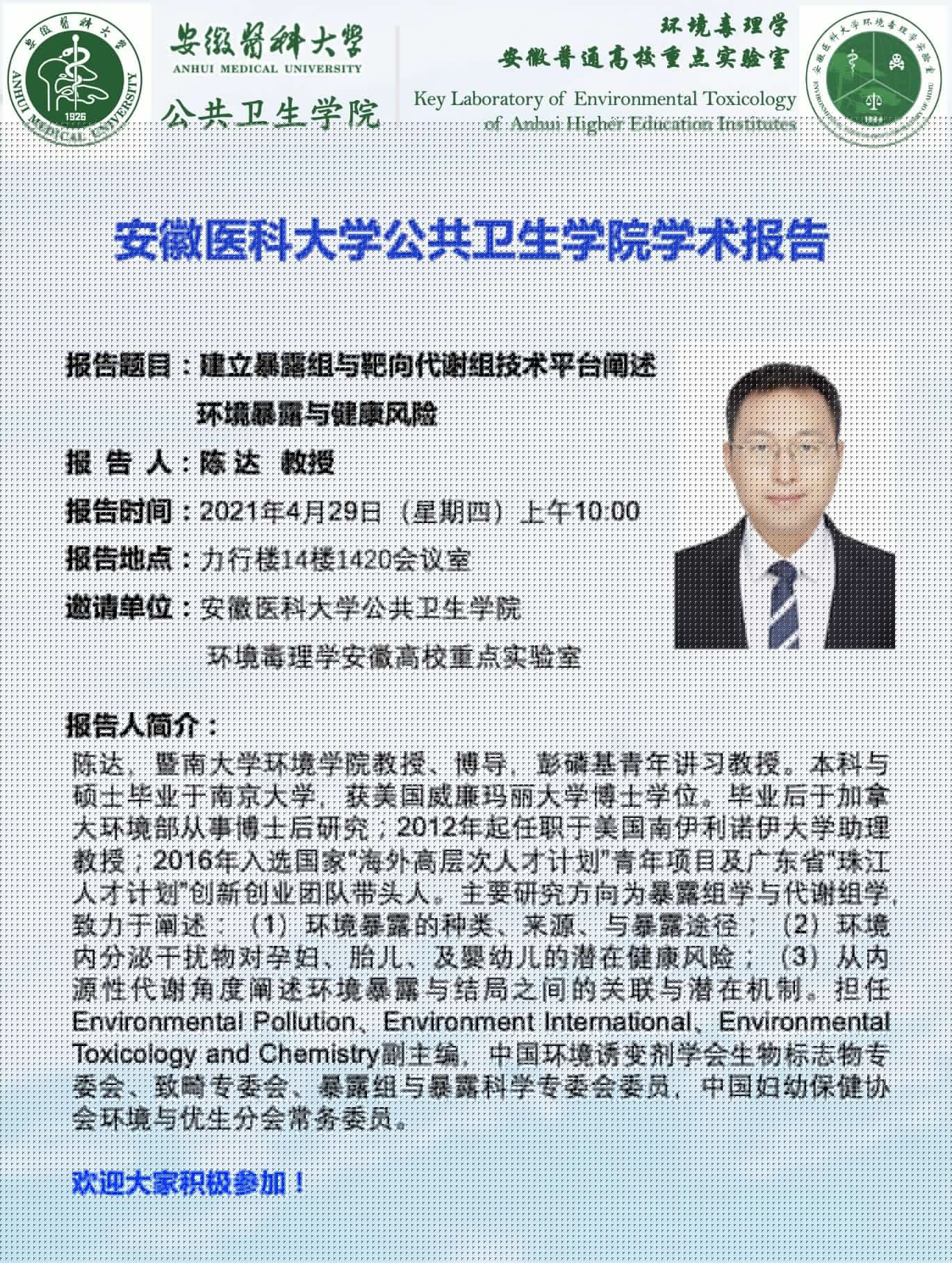 4月29日学术报告预告:建立暴露组与靶向代谢组技术平台阐述环境暴露与健康风险