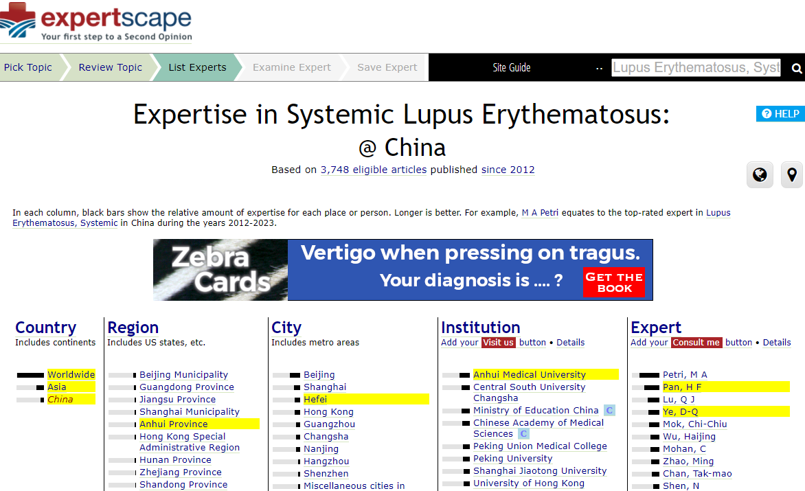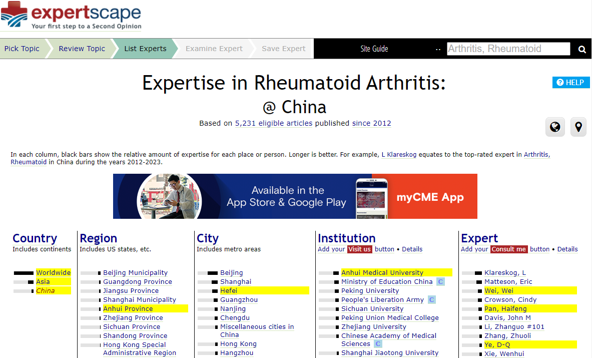 近日,欧洲著名机构Expertscape公布了2023年最新生物医学领域全球专家排名。在“Expertise in Rheumatoid arthritis”(全球类风湿关节炎专家排行榜)和“Expertise in Systemic Lupus Erythematosus” (全球系统性红斑狼疮专家排行榜)上,我院叶冬青教授和潘海峰教授均排名全球前列。