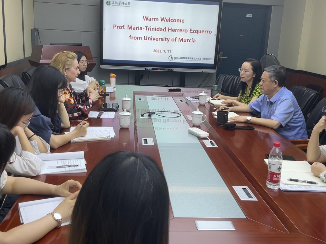 2023年7月11日,西班牙穆尔西亚大学玛丽亚-特立尼达·埃蕾罗·埃兹奎罗(María-Trinidad Herrero Ezquerro)教授来访出生人口健康教育部重点实验室,陶芳标教授、孙莹教授、王取南教授和朱贝贝副教授,以及部分硕博生等20余人参加了交流会。会议交流由孙莹教授主持。