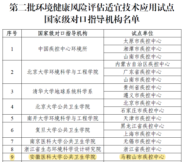为响应《“健康中国2030”规划纲要》《健康中国行动(2019—2030年)》提出的“建设健康环境”有关要求,国家疾病预防控制局综合司开展第二批环境健康风险评估适宜技术应用试点工作。我校附属马鞍山市疾病预防控制中心获批第二批环境健康风险评估适宜技术应用试点,我院为附属马鞍山市疾病预防控制中心试点的国家级对口指导机构,将对试点工作开展一对一的技术指导和专业支撑,以提高试点单位适宜技术应用的质量和效果。