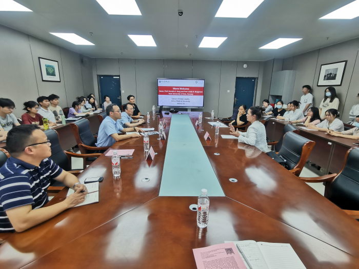 马军成对他们的到来表示热烈欢迎,感谢方飞校友对母校的关心,希望发挥校友的纽带作用,与挪威奥斯陆大学建立稳定的交流合作关系。王华介绍了高水平公共卫生学院建设情况,对两位专家在基础成果转化临床研究取得的成绩表示祝贺,期待双方进一步加强国际交流与合作。