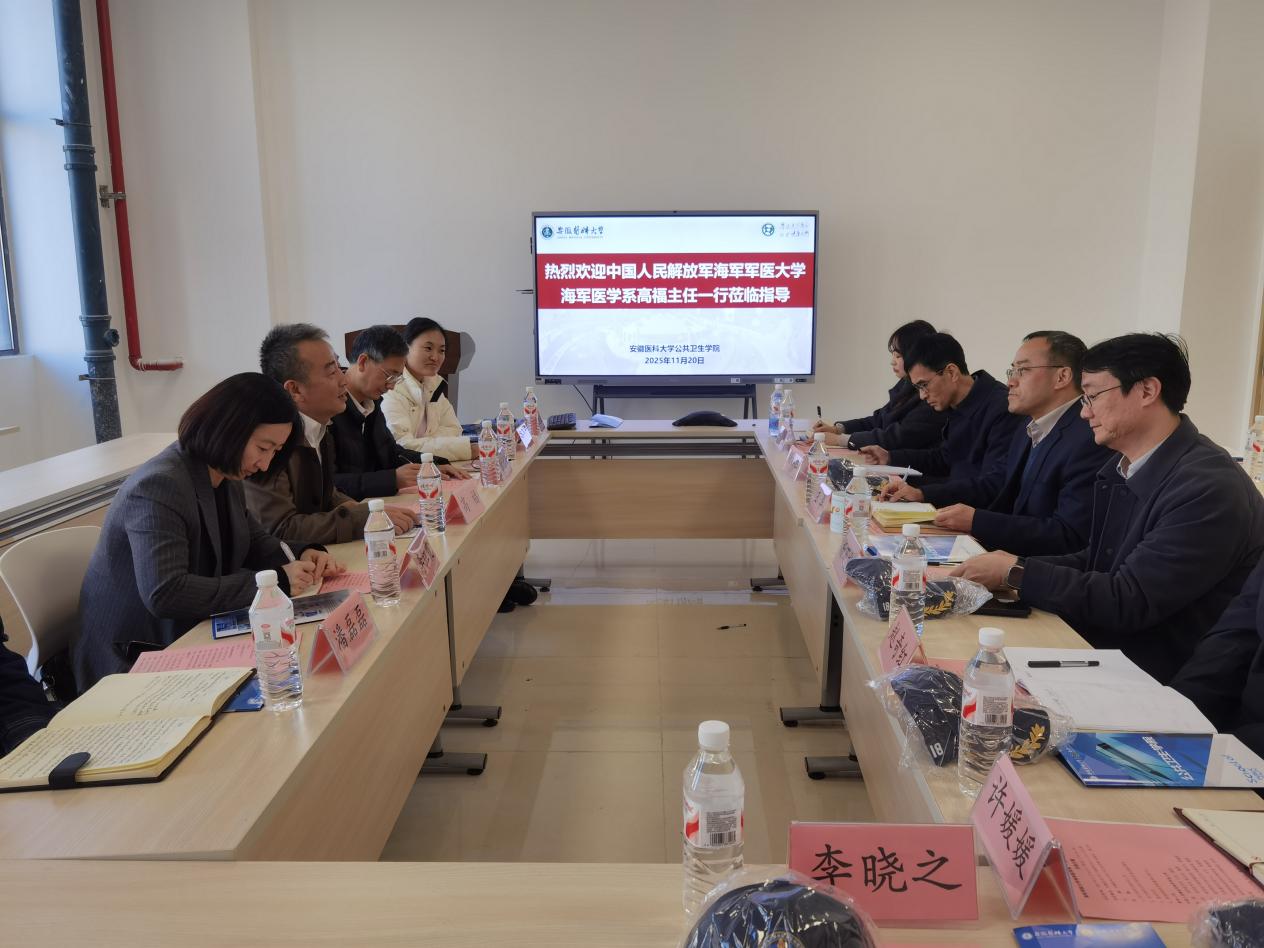 2025年11月20日下午,中国人民解放军海军军医大学海军医学系主任高福带队访问我院。海军军医大学作为国家“双一流”建设高校,海军医学系主建的公共卫生与预防医学学科在第五轮学科评估中获评B+、骨干支撑的特种医学学科学科获评A,办学实力和学科建设水平突出。此次交流活动在新医科中心C111会议室举行,由学院副院长杨万水主持。院长王华出席会议。